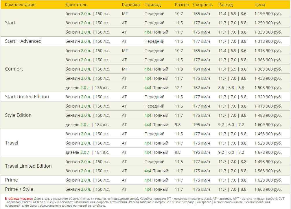 | Prime + Style | бензин 2 л. | 150 л.с. | АТ | Полный | 11.7 сек. | 175 км/ч. | 11.7 | 7.0 | 8.8 | 1 668 900 | |